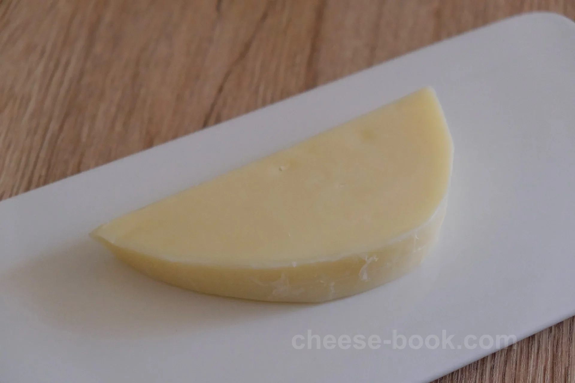 イタリアからの輸入品で「プロヴォローネ・フィアスケット」(Provolone Fiaschetto)です。 「Fiaschetto(フィアスケット)」はイタリア語で小型のフラスコや小瓶の意味があり、すでにカットされているため形状はわかりませんが、その名のとおりやや丸みを帯びたフラスコ型・樽型に成形されて作られるプロヴォローネ。
