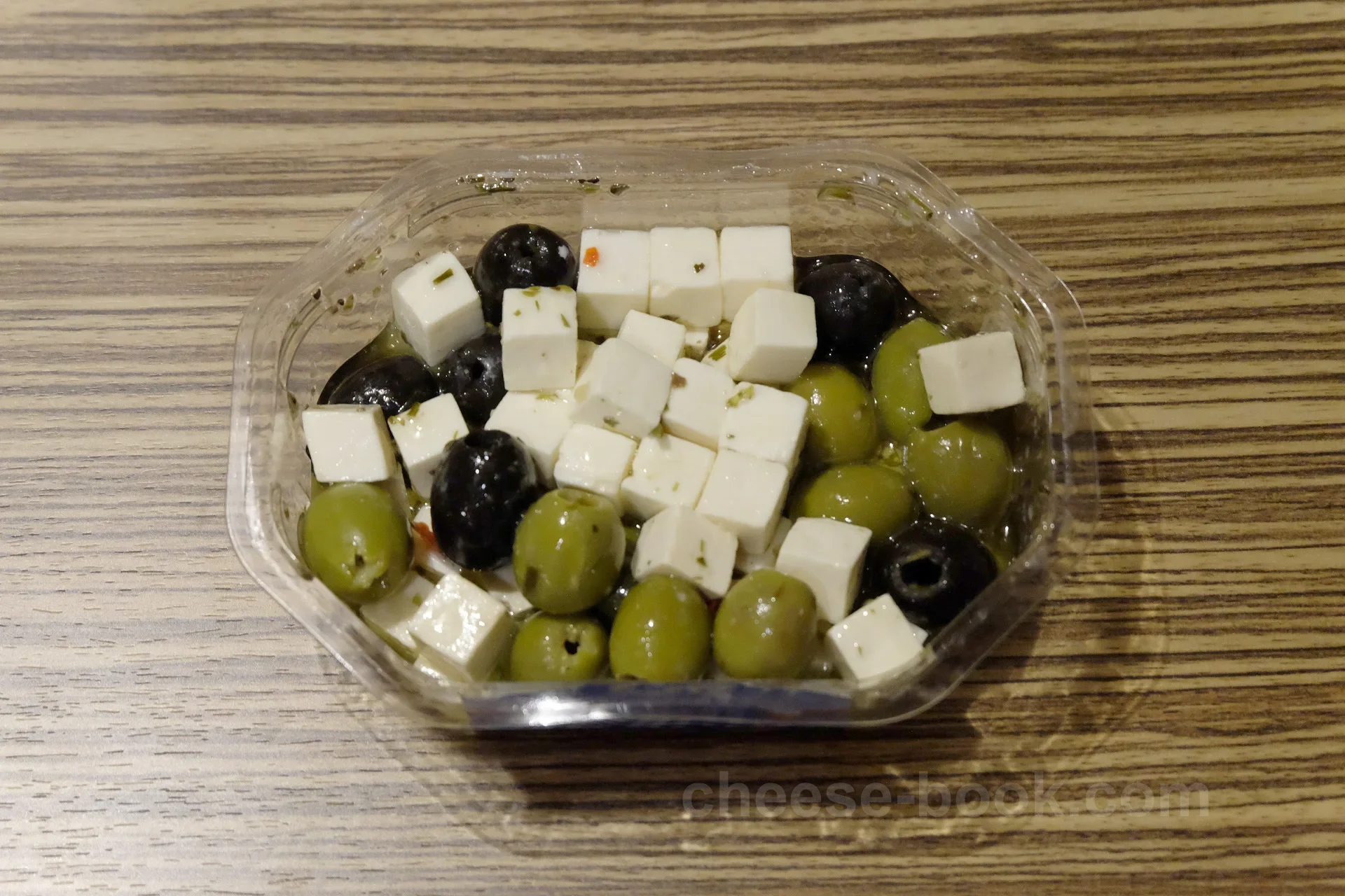 Taverna社のフェタチーズ入りサラダ「Salad Cheese in oil」です。 成城石井 ラスカ小田原店で購入、2015年12月当時内容量150gで499円(税込539円)でした。