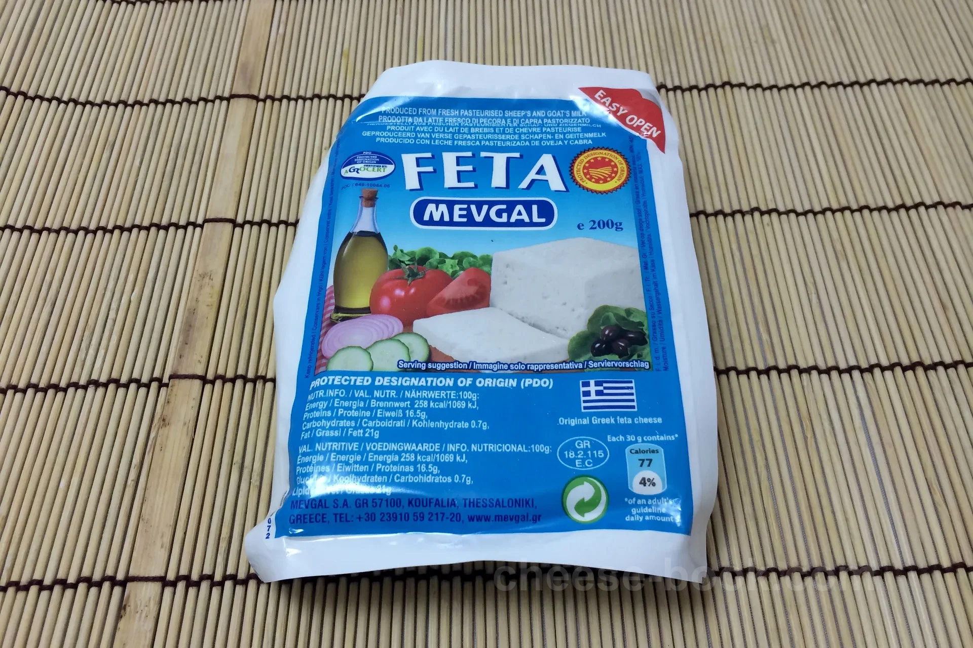 ギリシャのMEVGAL(メヴガル社)のフェタチーズで、現地のPDO(原産地名称保護)認定商品。 羊乳(70%以上)と山羊乳(30%以下)の混合乳でした。 2014年8月に成城石井 名古屋駅広小路口店で購入。