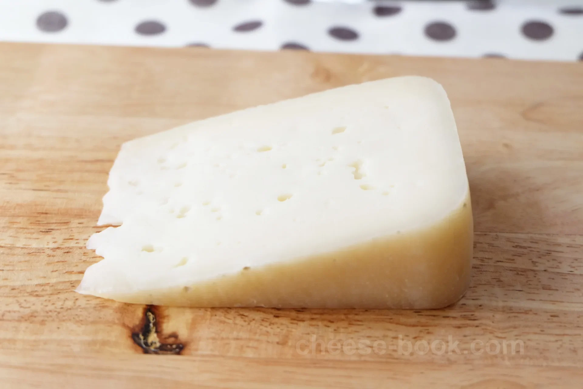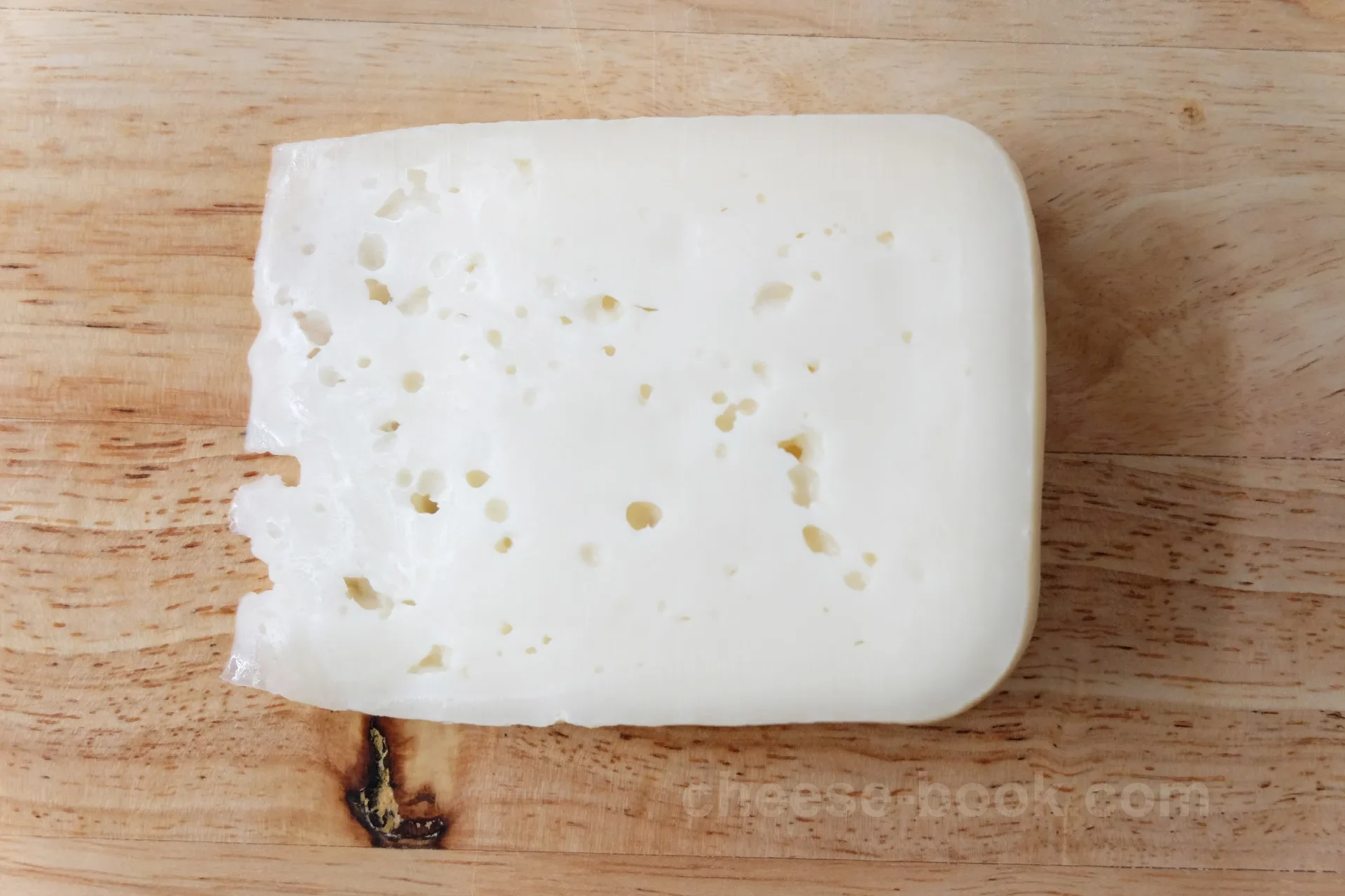 外皮は湿り気があり、オレンジがかった黄色で、綿毛状のカビがところどころに見られます。内部は艶のある湿った生地の中に、灰色や緑色の青カビが空洞を埋めるように広がっています。