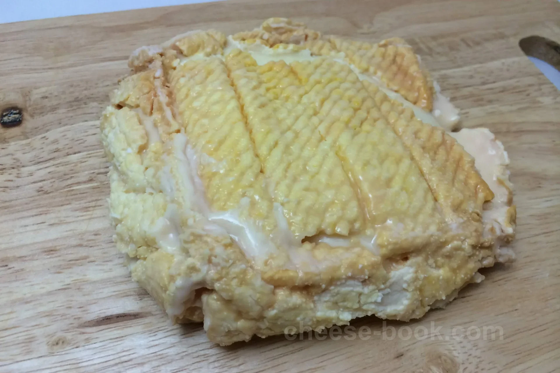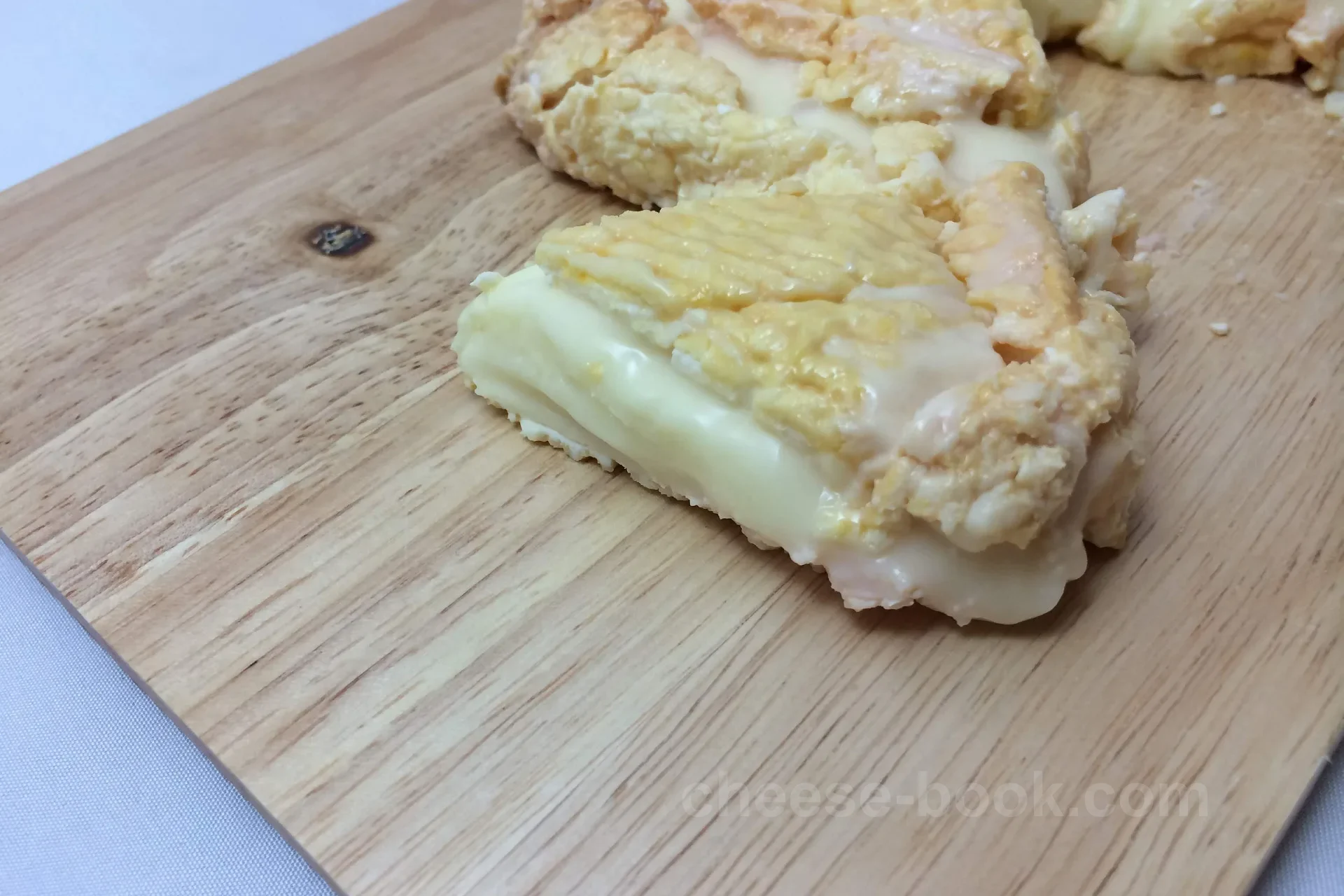 内部の生地はやわらかくクリーミーで、熟成が進むにつれて外皮付近からとろとろに溶けていきます。中心部には芯が残るため、熟成度によって異なる食感の層を楽しめます。